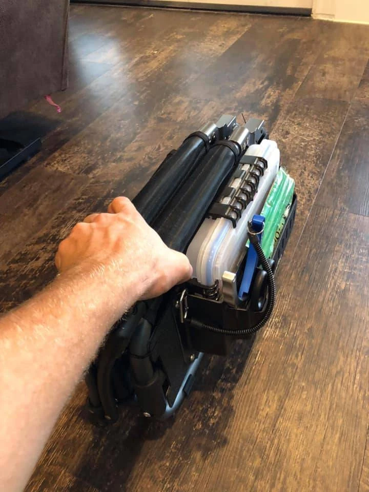 The Prison Pocket with Larry Chair Adapter Kit is a storage system designed to hold nearly anything. This has a large pocket to hold tackle boxes at the rear (275mm L x 118mm H x 45mm D) and a smaller pocket on the front to hold soft plastic pouches or smaller tackle trays (170mm L x 60mm H x 24mm D). The slots on the front of the small pocket are used for hanging jig heads or lures. The two formed Vs on the side are made for holding pliers, scissors and fish grips. This is formed from ABS plastic and can hold the following. The Larry Chair Adapter Plate is included with hardware. Â